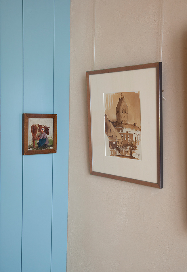 "We hebben het huis ingericht met Scandinavische designmeubelen uit de jaren 50," vertelt Trudy, "we houden daar erg van en we vonden daarnaast dat het met zwaar antiek te veel een museum zou worden, de meubels zijn echt van ons, ze geven een persoonlijk tintje." Aan de muur hangen Nederlandse en Friese schilderijtjes en dorpsgezichten van Stiens. "Naast onze jaren 50 meubels hebben we modern design toegevoegd, het tafeltje in de keuken wat onder het raam staat met uitzicht op de tuin is beschilderd met modern Hindeloper schilderwerk, de sprei op ons bed is van een textielkunstenares en het servies in de kast is modern Workumer aardewerk, die moderne design en kunst brengt het huis helemaal naar de tegenwoordige tijd." Over elk detail is nagedacht. De oude apotheek aan de zijkant van het huis is helemaal in ere hersteld. "Alles wat erin staat is van de voormalige dokters die generaties lang in dit huis woonden," vertelt Trudy, "voorgeschreven medicijnen werden hier gemaakt en afgegeven, via een speciaal luikje. We vonden het leuk dit zo te herstellen."