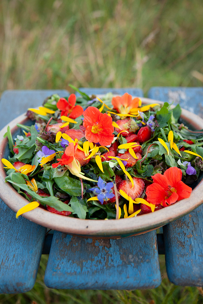 A Fresh Garden Salad with Strawberries & Edible Flowers