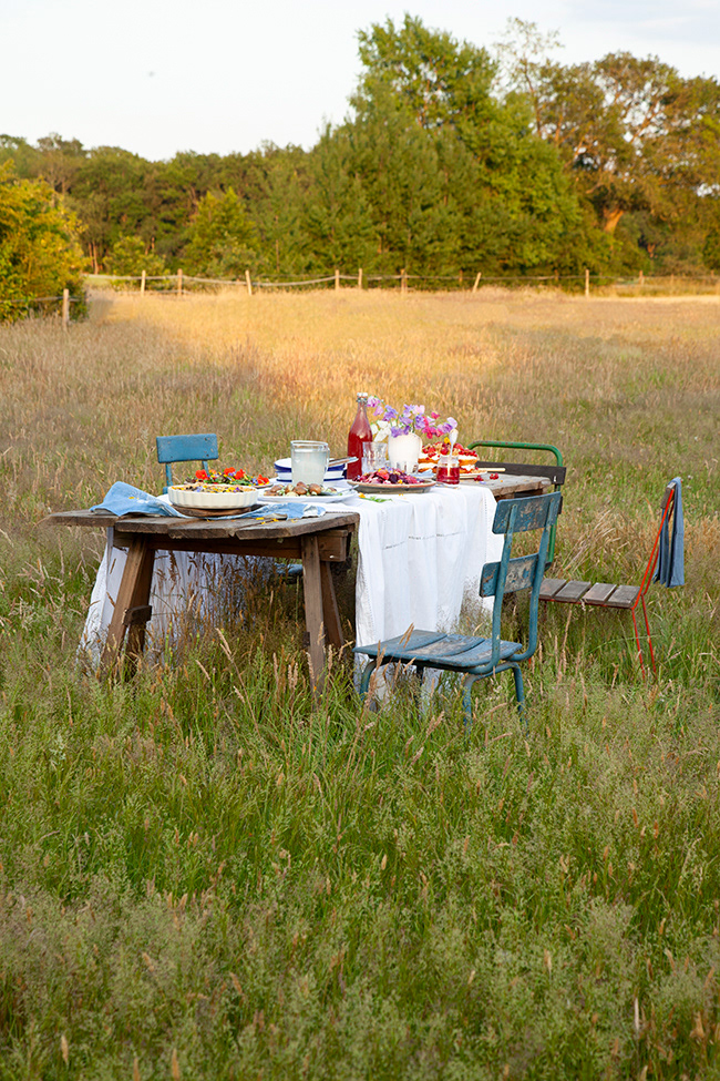 Celebrate the beginning of summer. Outdoors, a nicely set table with fresh flowers from the garden and dishes made with all what's in season. As fresh as possible, picked from the garden or bought super fresh at a local farmer's market. Prepare your dishes in advance so there is loads of time to relax, unwind, and enjoy the moment.