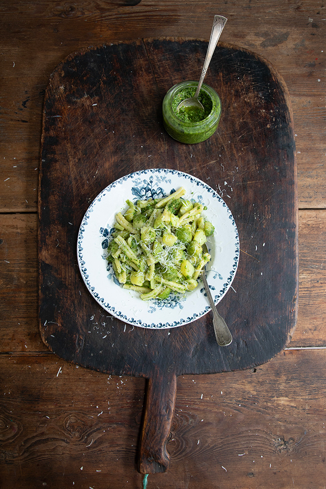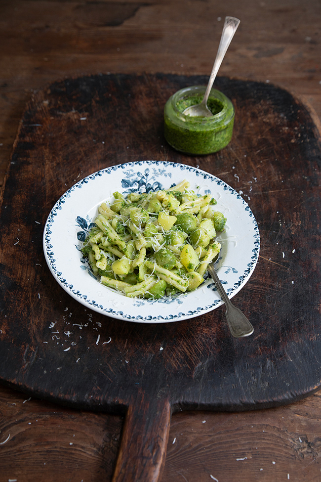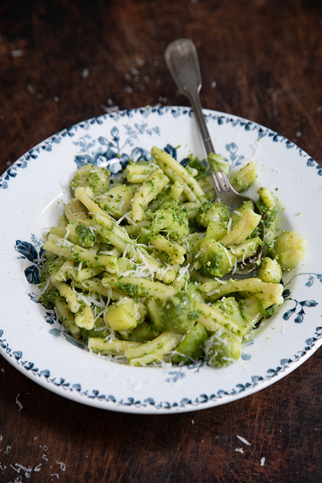 Pasta with brussel sprouts, potatoes and kale pesto
